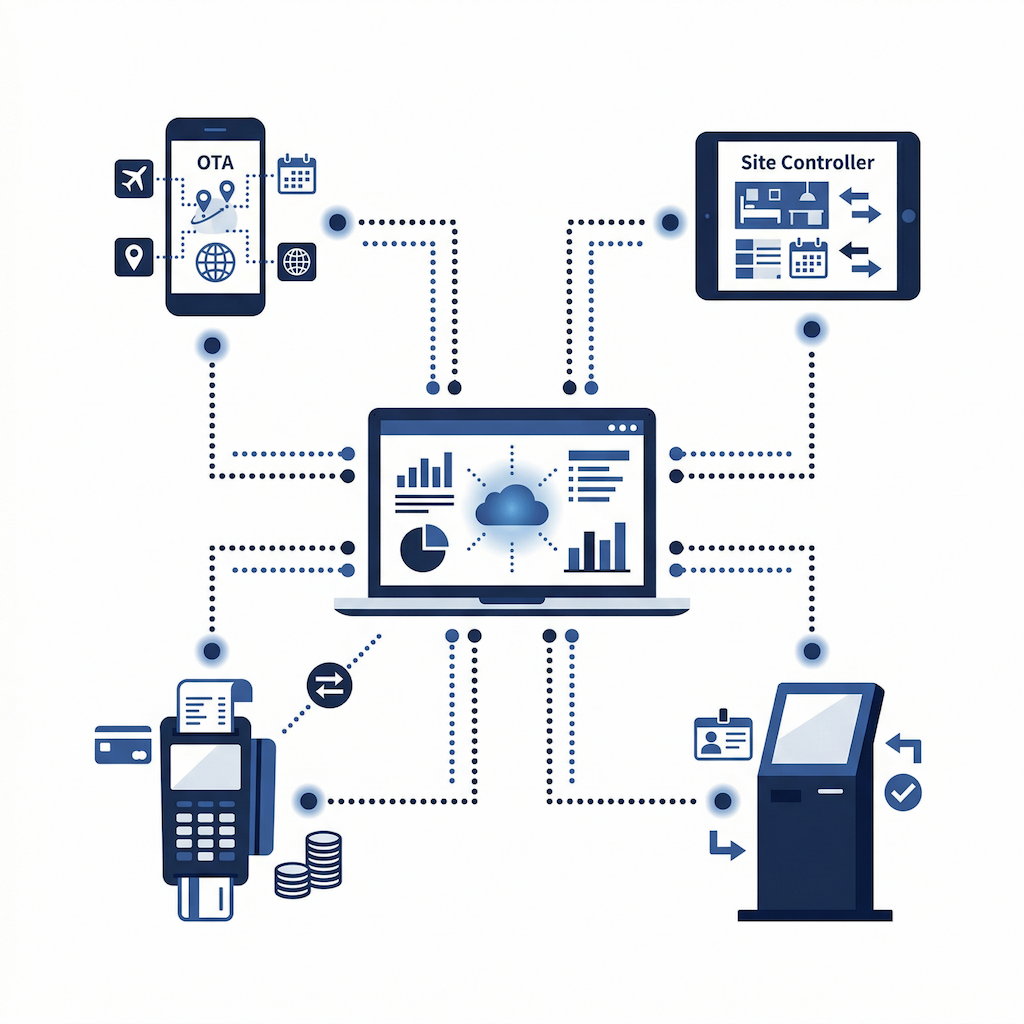 はい。セルフチェックインシステム(システムギア社製/アルメックス社製)との連動でフロント業務を効率化できます。また、客室清掃管理システム(バルテック社/MOTHotel Lite)でリアルタイムの清掃状況管理にも対応しています。