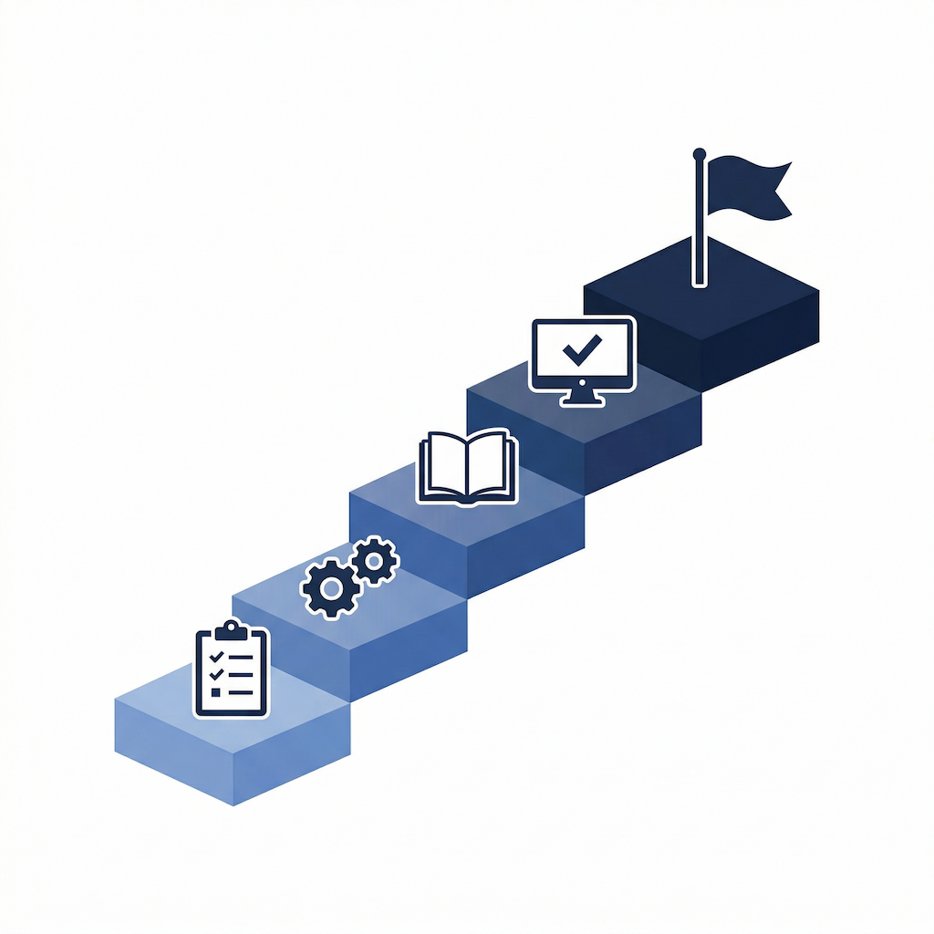 施設規模や既存システムの状況により異なります。ヒアリング→マスタ設定→操作説明→シミュレーション運用→本番稼働の流れで進め、本番当日は導入担当者が立会いでサポートします。お気軽にお問い合わせください。